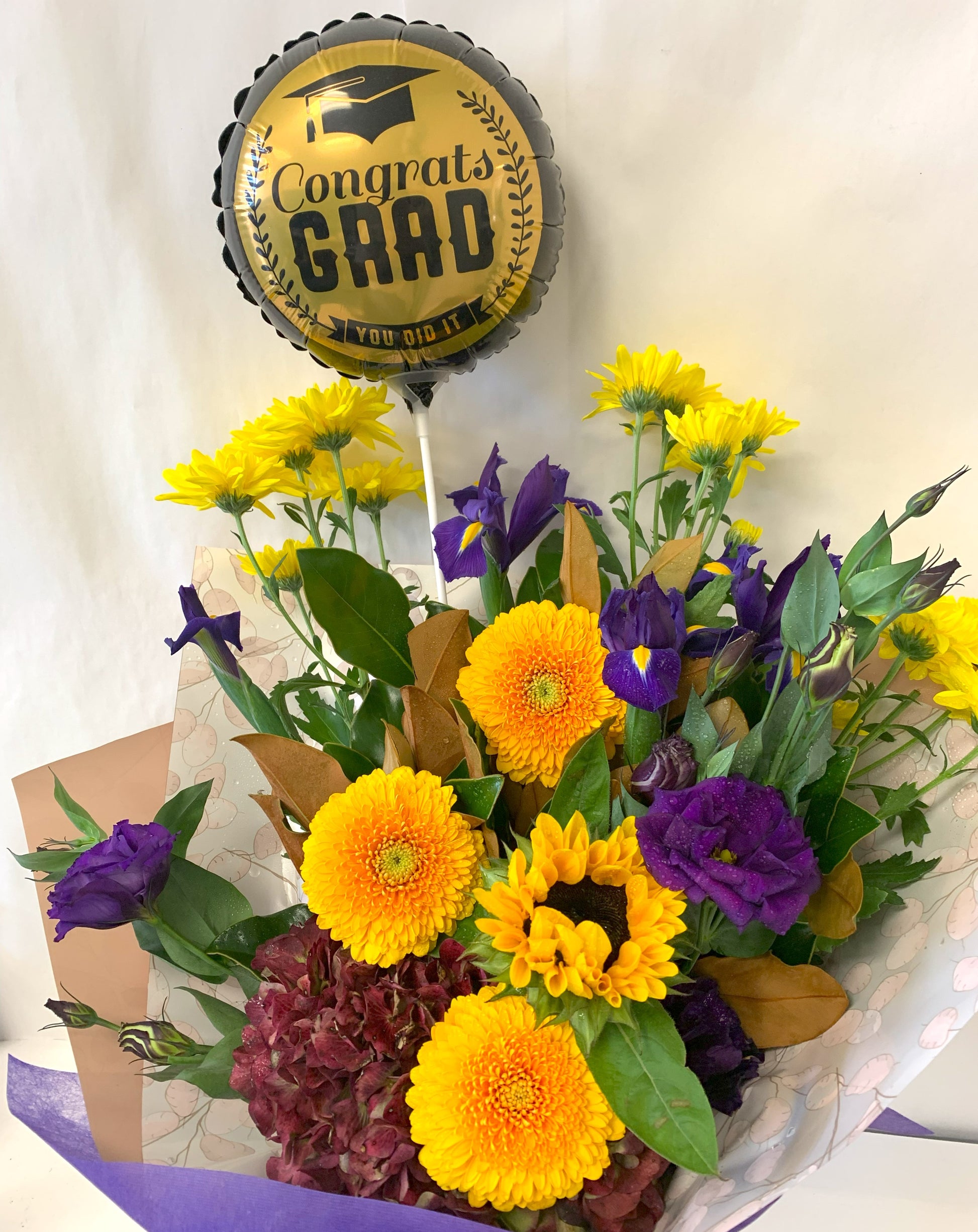 Yellow and Purple Graduation Flowers, designed to celebrate achievements in style. This bouquet features irises, cheerful sunflowers, hydrangeas, and chrysanthemums. Finished with a foil balloon.